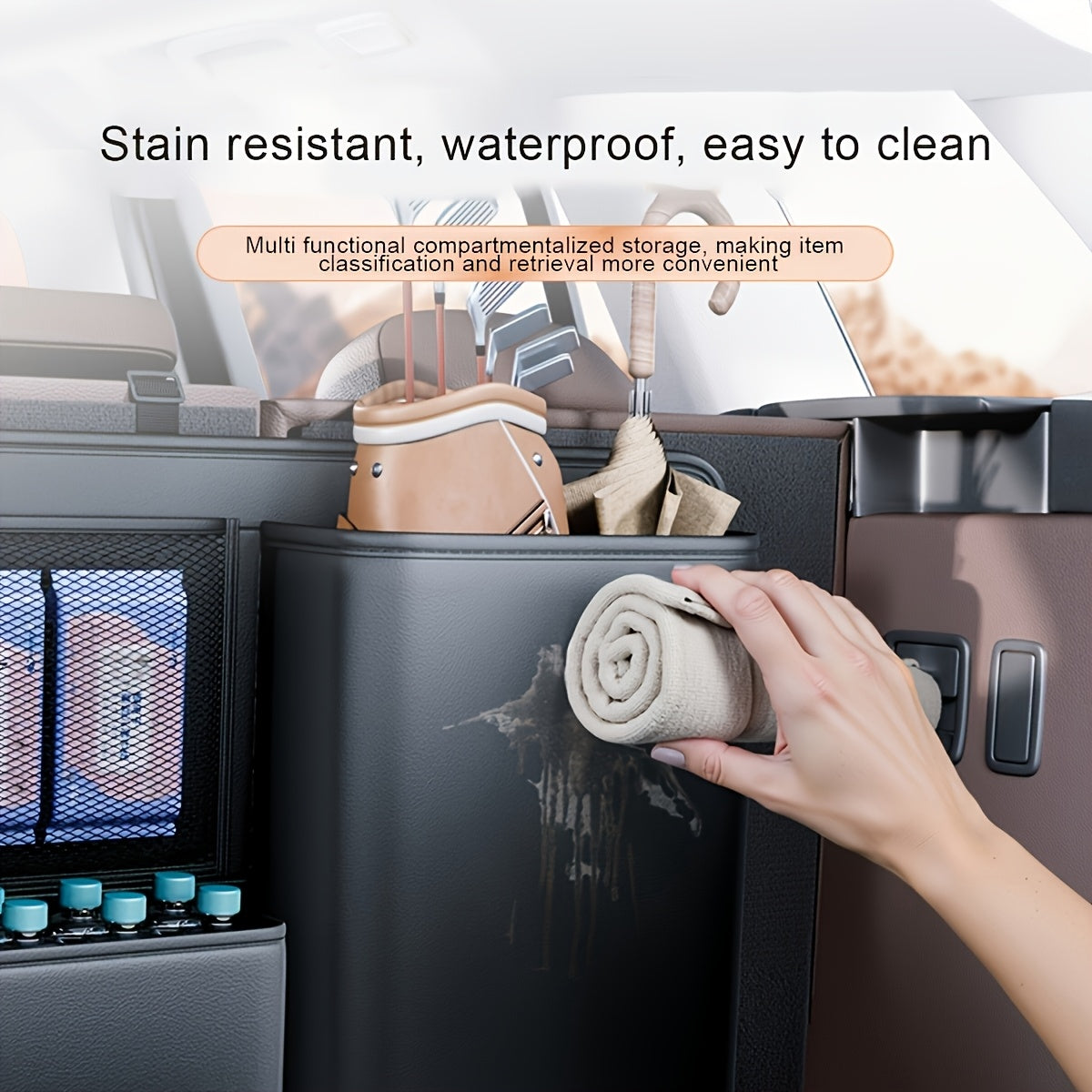 Mantén el interior de tu vehículo impecable y aprovecha al máximo el espacio con este organizador grande tipo baúl. Fabricado en cuero PU de alta calidad, ofrece una solución universal y elegante para guardar accesorios outdoor, herramientas, compras, equipos deportivos y mucho más.